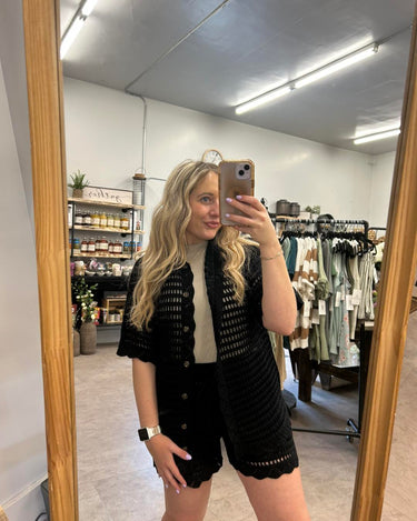 Introducing our versatile BLACK POINTELLE SWEATER SHIRT AND SHORTS SET, perfect for both spring and summer! Stay stylish and comfortable with this set, featuring a unique pointelle design. The lightweight material is perfect for warmer weather, making it a must-have addition to your wardrobe.