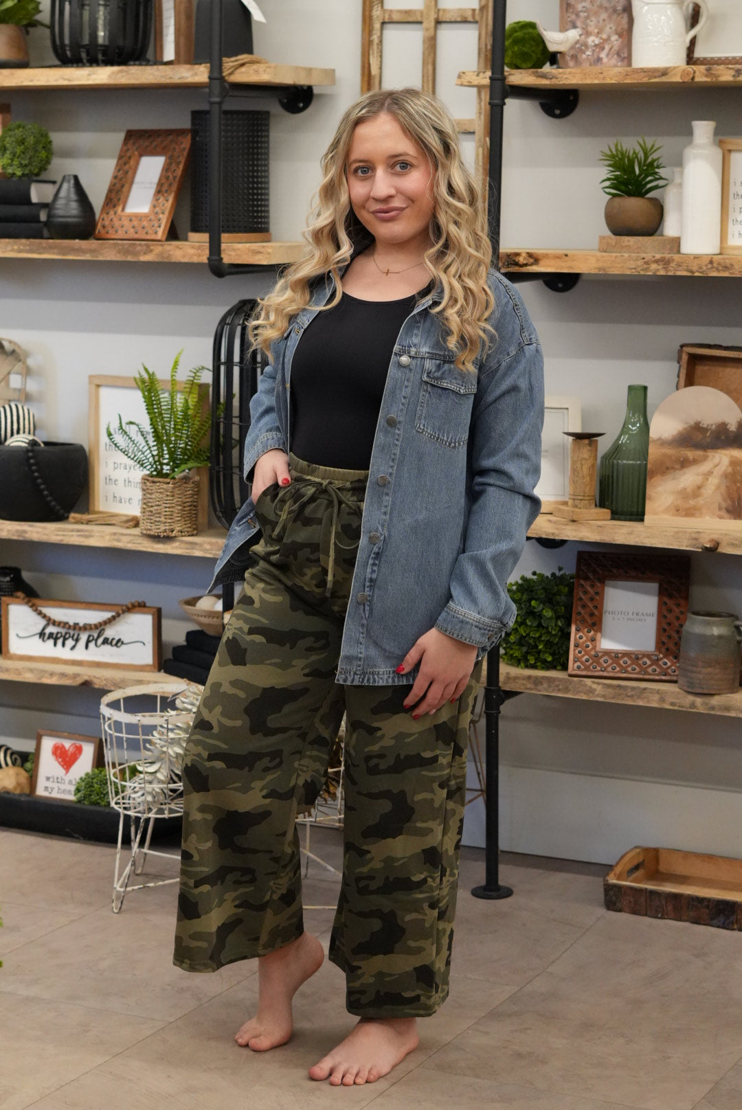 Effortless and versatile, these camo wide leg pants feature a relaxed silhouette with an elastic drawstring waistband and roomy front patch pockets. Perfect for off-duty days, gameday styles, or casual streetwear looks. Lightweight and easy to pair with tanks, tees, or hoodies.
