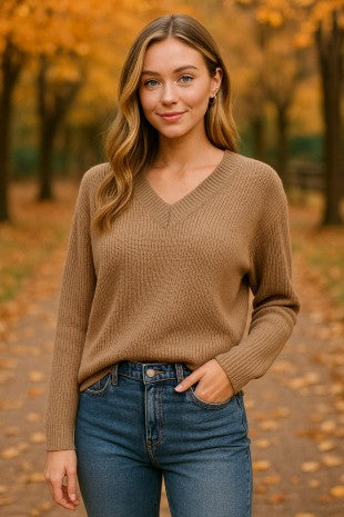 This classic V-neck sweater is a must-have staple for a stylish and effortless fall look. Designed with a relaxed fit and soft knit texture, it offers all-day comfort without compromising on style. The ribbed cuffs and hem add a subtle touch of structure, while the versatile silhouette pairs perfectly with skirts, jeans, or trousers.